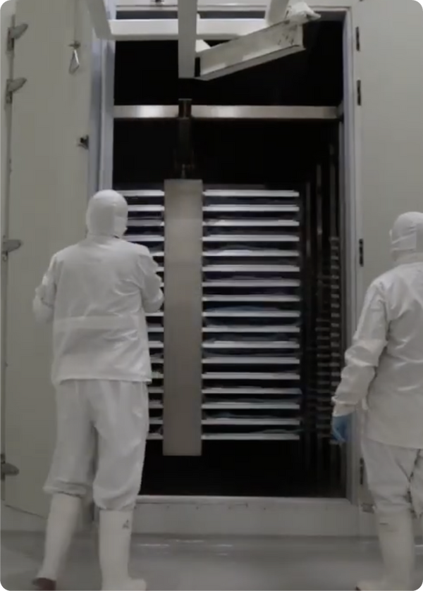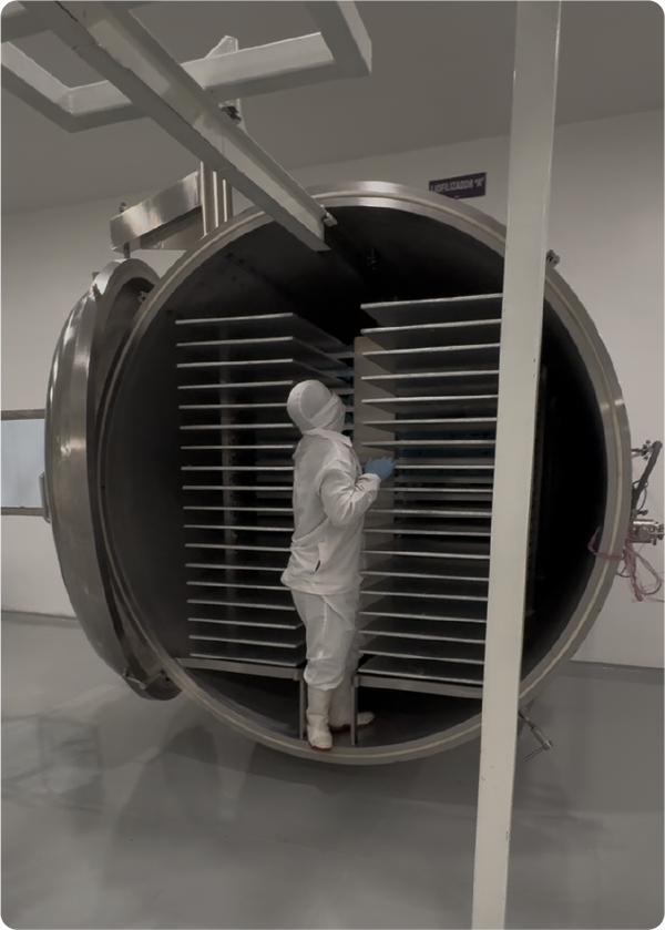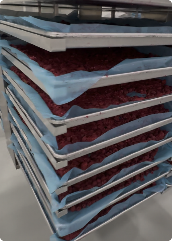 Lo sacamos del hiper-congelador y la llevamos a la liofilizadora donde el hielo e convierte en vapor a - 60°, dejando la fruta seca y liviana.