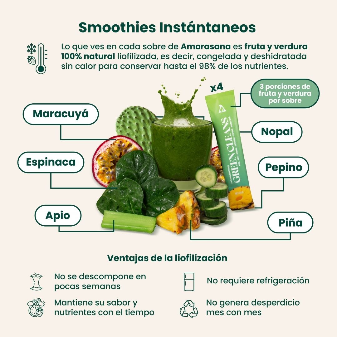 Amorasana es una marca mexicana de smoothies instantáneos elaborados con frutas y verduras 100% naturales, liofilizadas (es decir, les quitamos el agua en frío para conservar nutrientes, sabor y color sin conservadores). Son prácticos, saludables y pensados para personas que quieren cuidar su salud sin complicarse la vida.