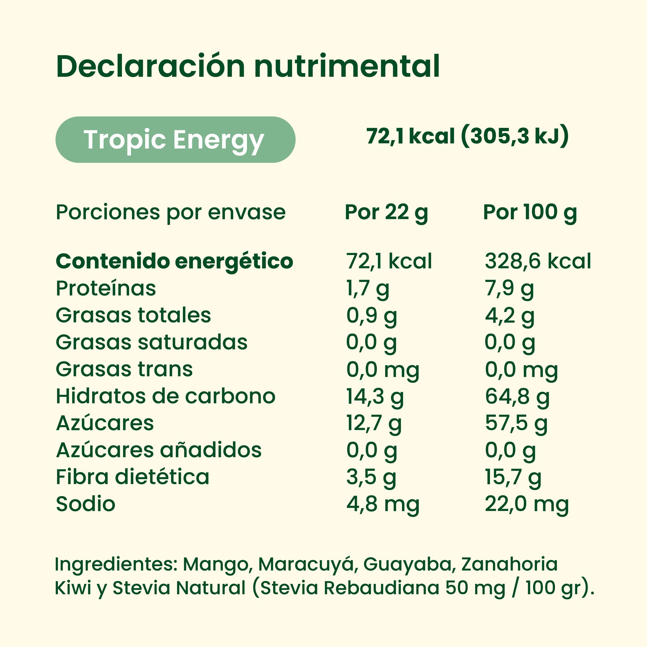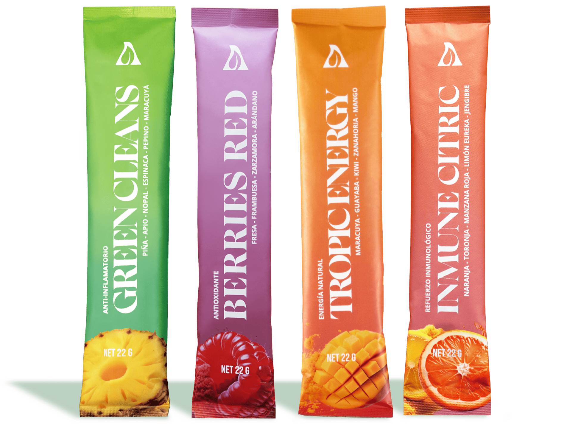 Disfruta de 3 porciones de fruta y verdura 100% natural en cada sobre