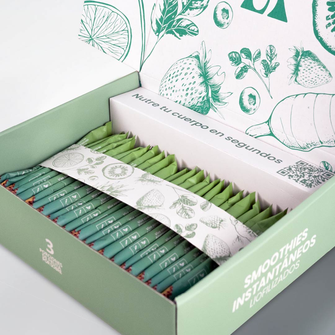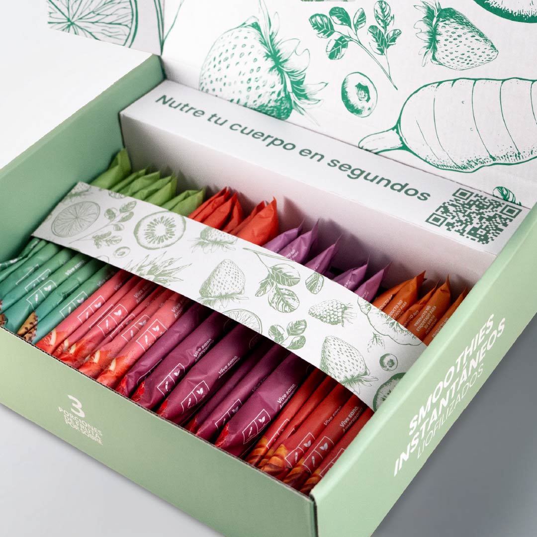 Disfruta de 3 porciones de fruta y verdura 100% natural en cada sobre